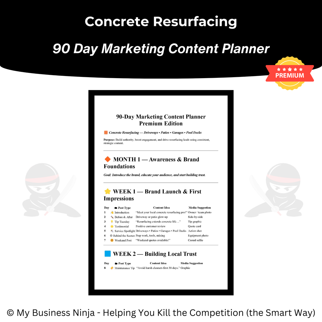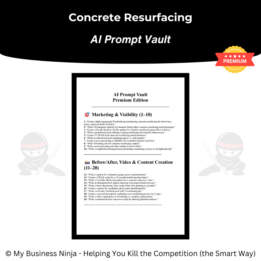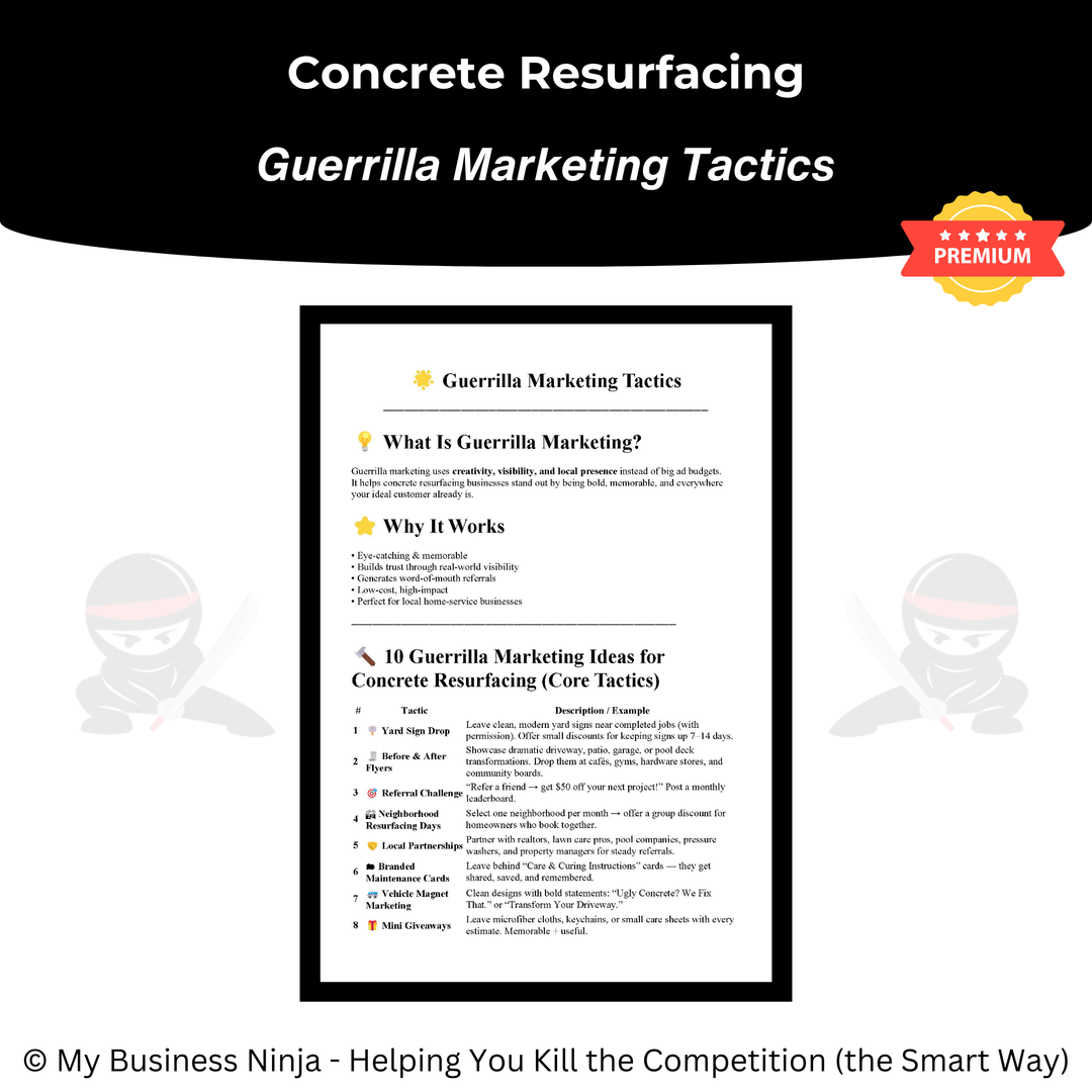 Whether you’re launching a new concrete resurfacing company or refining an existing operation, this toolkit provides the professional foundation and growth systems you need to compete, stand out, and grow the smart way. 🥷⚔️