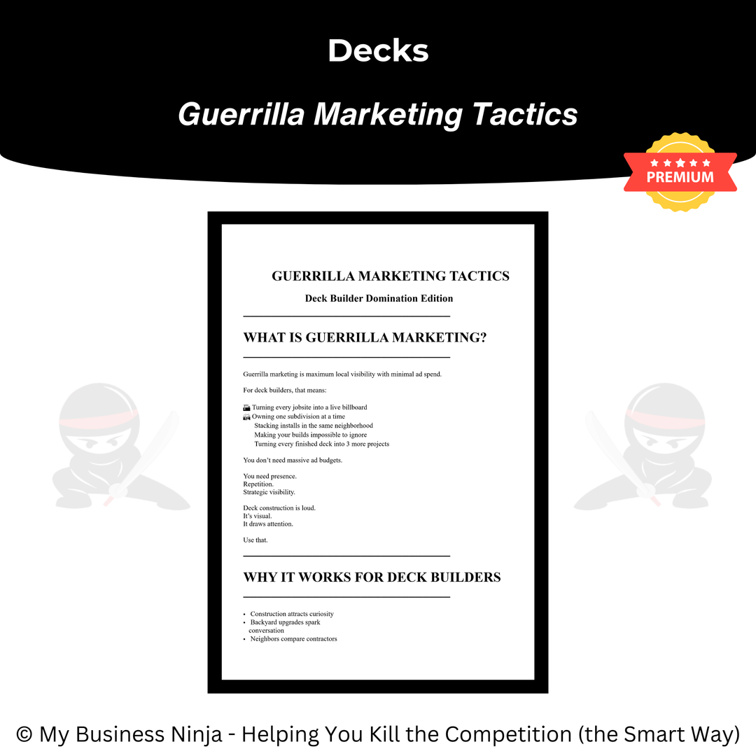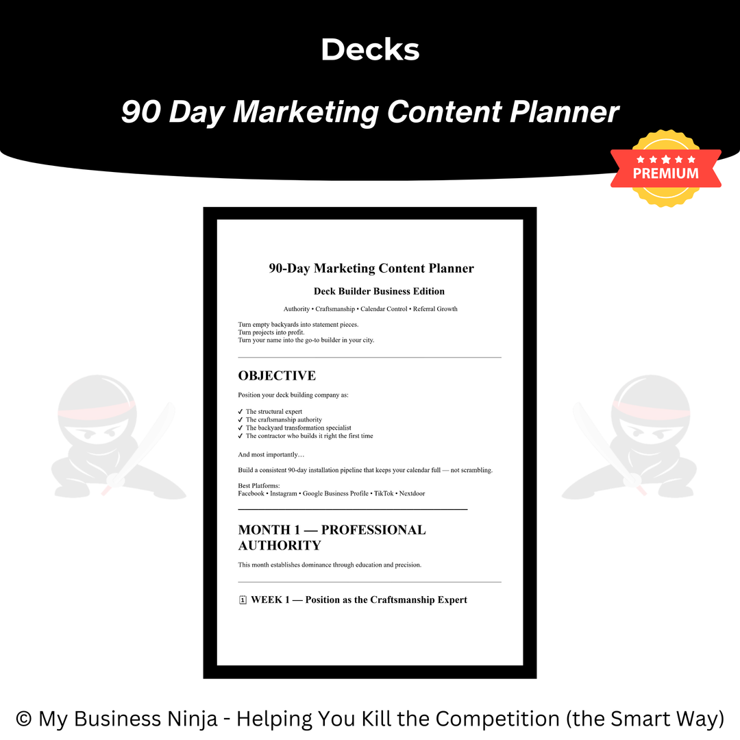 Whether you’re launching a new deck construction company or refining an established outdoor living brand, this toolkit provides the professional foundation and scalable growth systems you need to compete, stand out, and grow the smart way. 🥷🪵