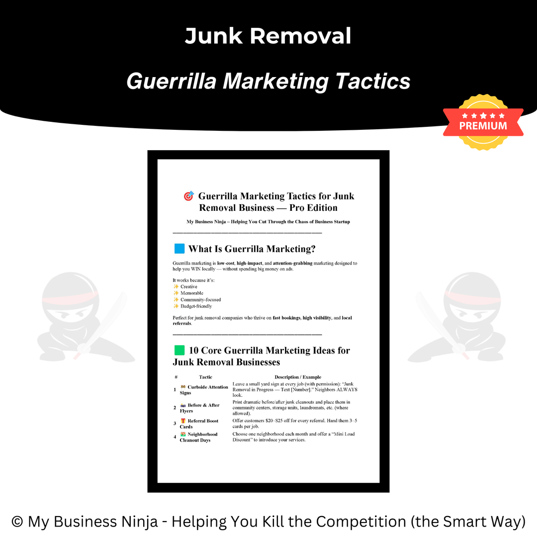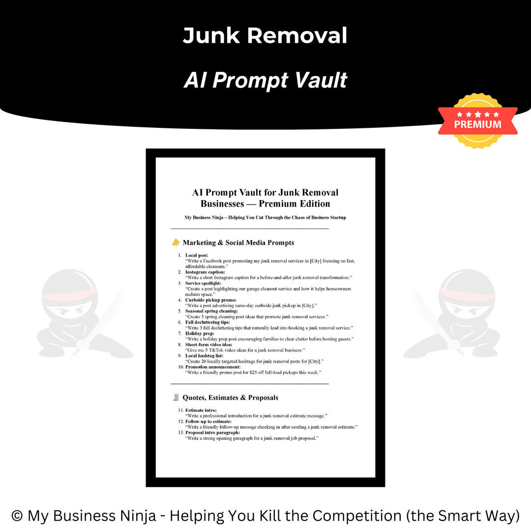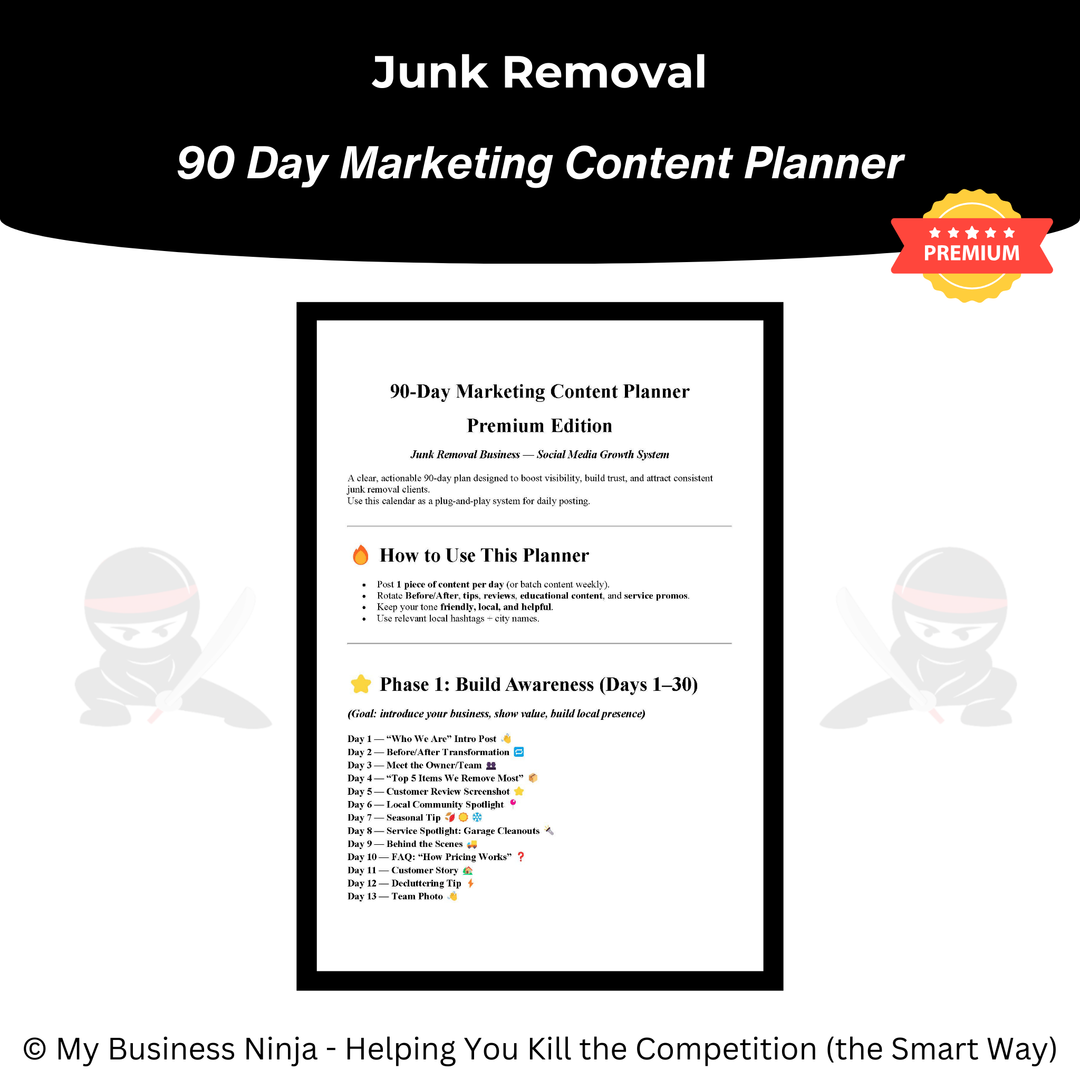 In addition to core operational and marketing tools, this collection also includes advanced playbooks and guides focused on branding, local positioning, competitive differentiation, sales confidence, and scalable growth strategies. Together, these resources help junk removal businesses appear more established, earn trust faster, close more jobs, and scale smoothly — even in crowded service areas.