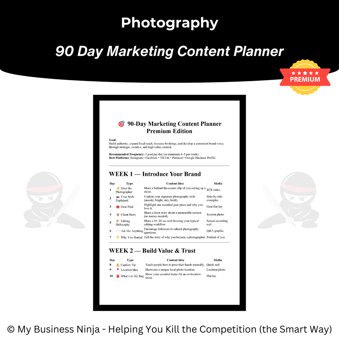 In addition to core operational and marketing tools, this collection also includes advanced playbooks and guides focused on branding, market positioning, competitive differentiation, sales confidence, and sustainable business growth. Together, these resources help photography businesses appear more established, earn trust faster, and scale more smoothly — even in crowded creative service markets.