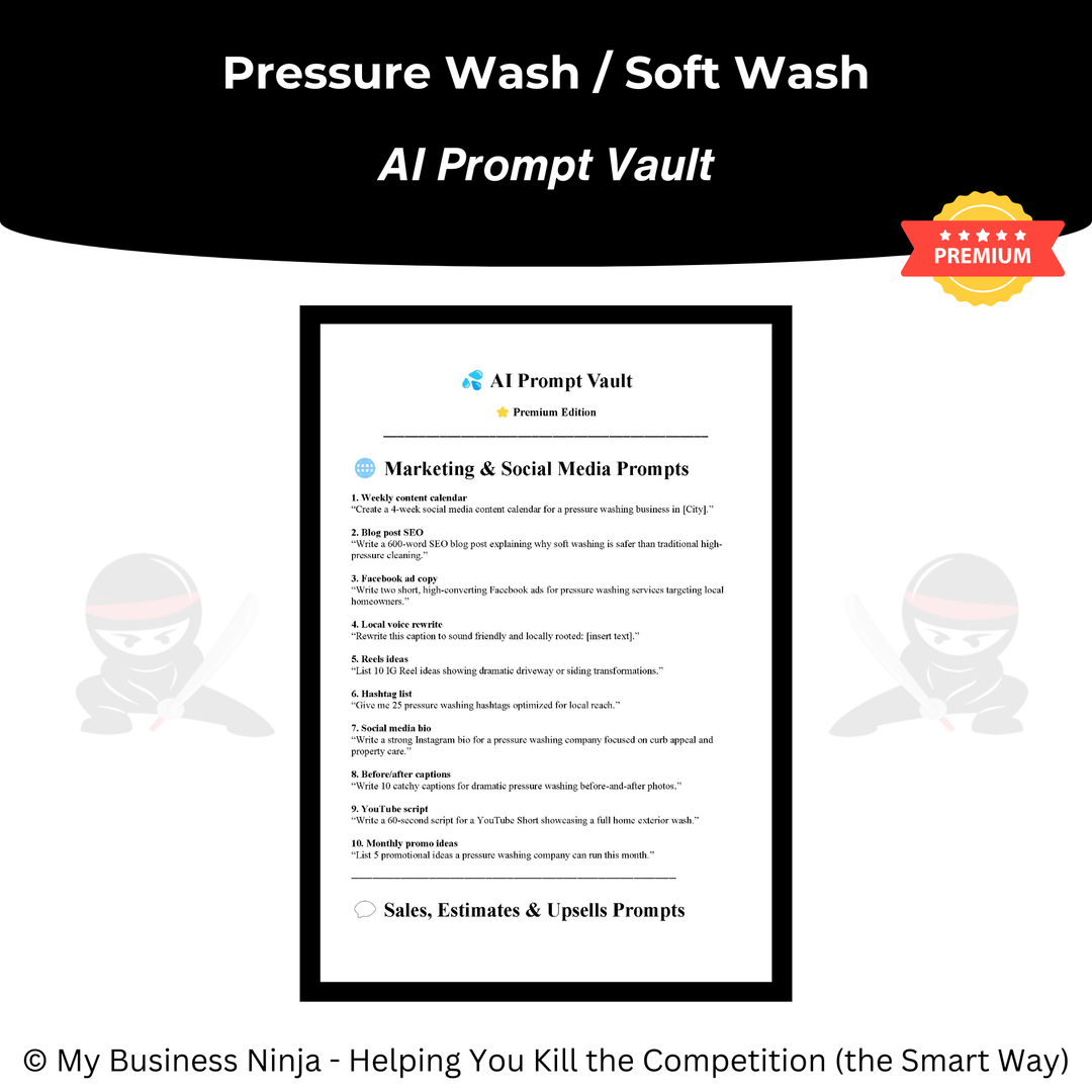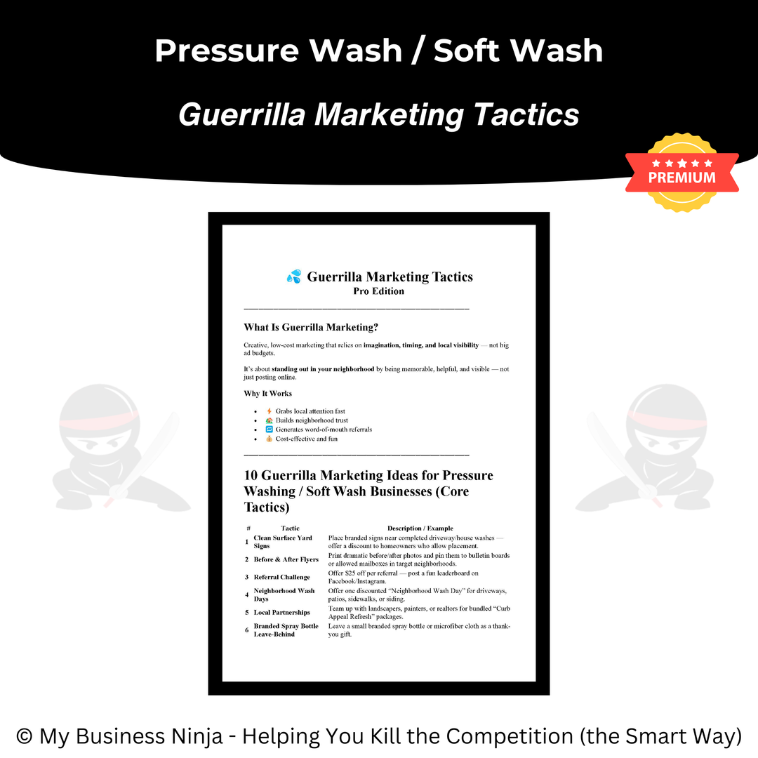 In addition to core operational and marketing tools, this collection also includes advanced playbooks and guides focused on branding, market positioning, competitive differentiation, sales confidence, and sustainable business growth. Together, these resources help pressure washing businesses appear more established, earn trust faster, and scale more smoothly — even in crowded exterior cleaning markets.