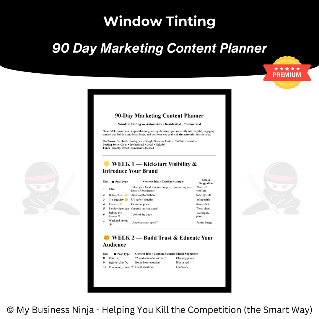 In addition to core operational and marketing tools, this toolkit also includes advanced playbooks and guides focused on branding, local positioning, competitive differentiation, sales confidence, and scalable growth strategies. Together, these resources help window tinting businesses appear more established, earn trust faster, close more high-value jobs, and grow smoothly — even in crowded automotive and home service markets.